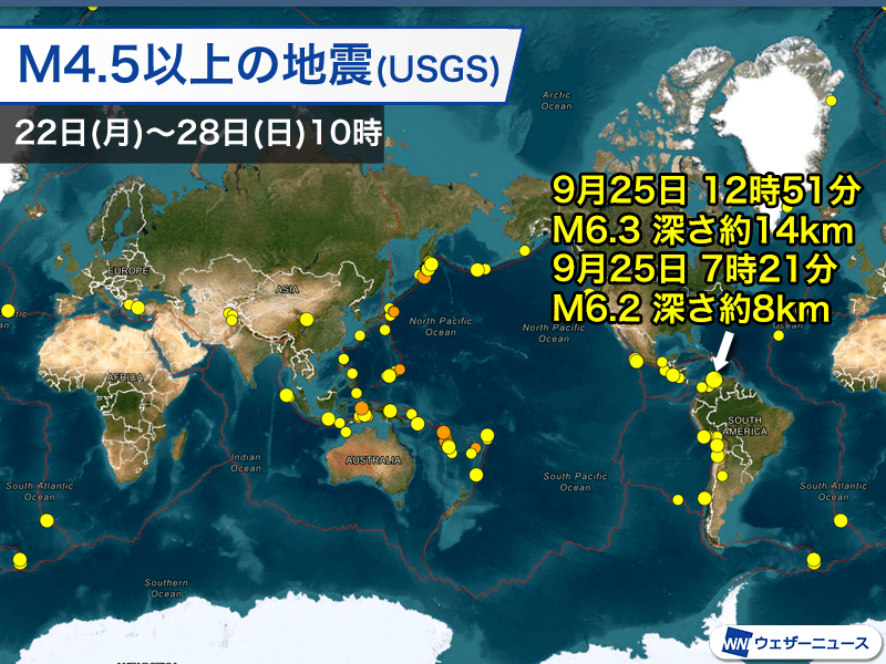 アメリカ地質調査所の解析によるマグニチュード6以上の地震は2回発生しています。最も大きな地震は、ベネズエラで発生したマグニチュード6.3です。