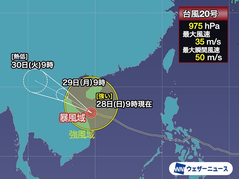 台風20号は、南シナ海を西に進んでいます。今後も西寄りに進み、今夜から明日29日(月)にかけてベトナムに上陸する見通しです。