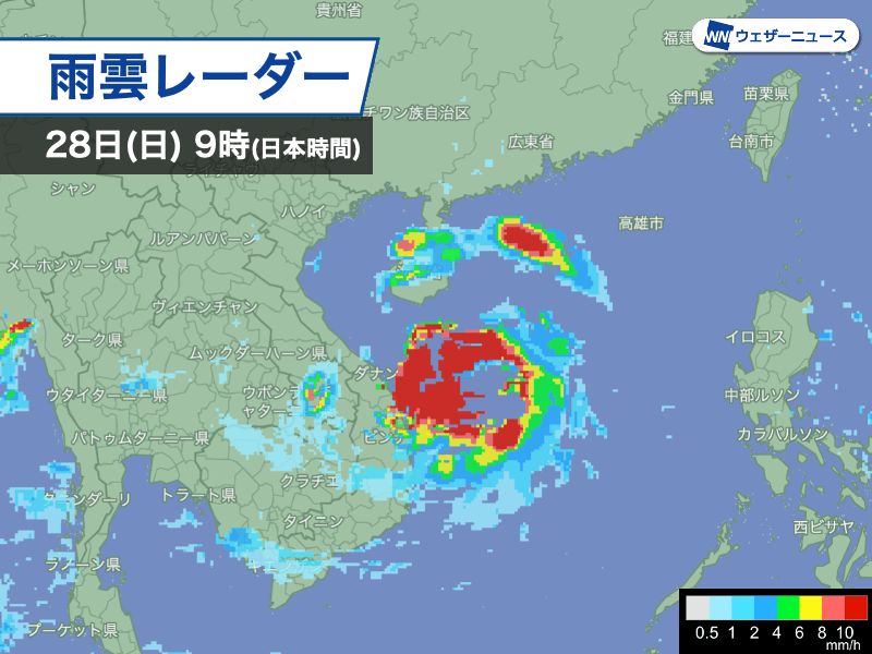 海南島やベトナムの一部には、台風周辺の活発な雨雲がかかり始めました。今後、台風の接近に伴ってさらに風雨が強まるとみられ、特に台風が直撃するベトナムは大きな影響が懸念されます。