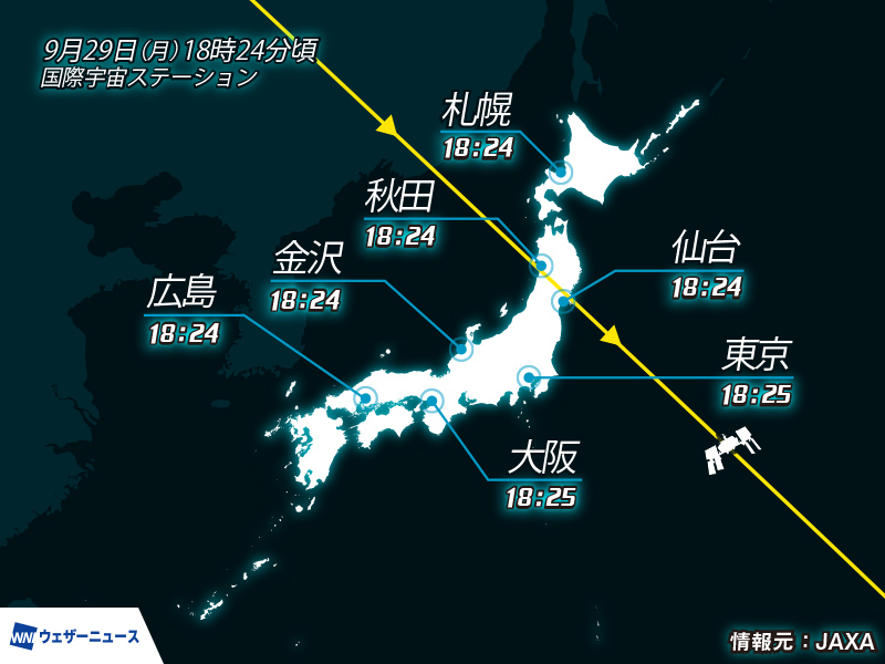 関東や東海、近畿など太平洋側では、雲の隙間からISSが見られるところがあるかもしれません。