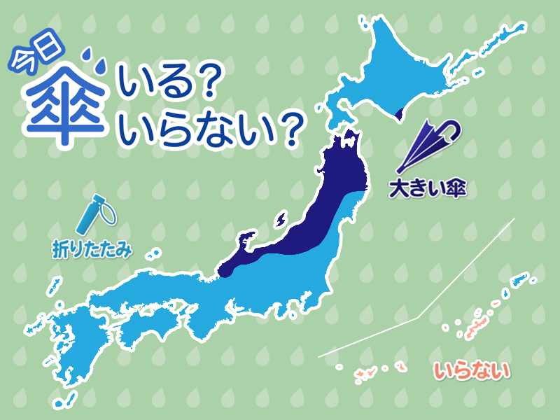 前線の南下に伴い、広く雨の降る可能性があります。特に、西日本や中部地方、東北南部では午前を中心に、一時的に雨が強まることがあるので注意してください。外出の際は、折りたたみ傘が必要です。