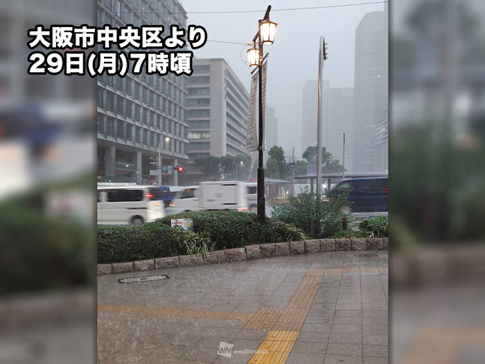 東北北部や北陸、大阪周辺や四国の瀬戸内側、九州南部では、通勤・通学時間帯に激しい雨となることがあるため注意が必要です。発達した雨雲のもとでは雷を伴っているところがあります。落雷にも注意してください。