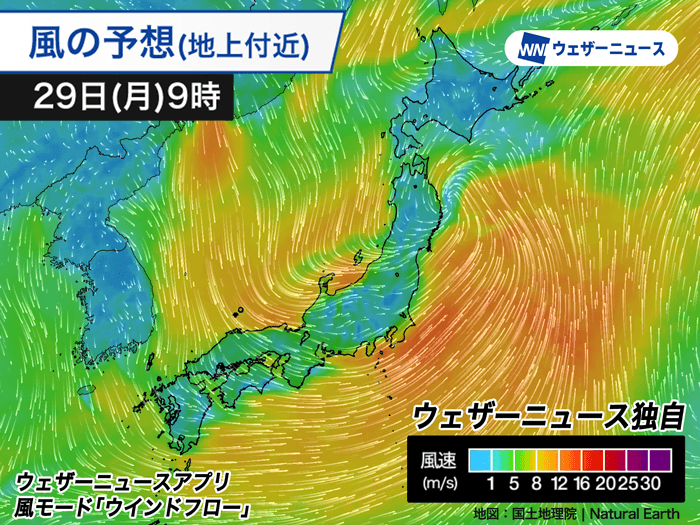 また、関東や東海など東日本の太平洋沿岸部でも南寄りの風が強く吹いています。強風は夕方にかけて続く見込みです。海岸では高波にも注意してください。