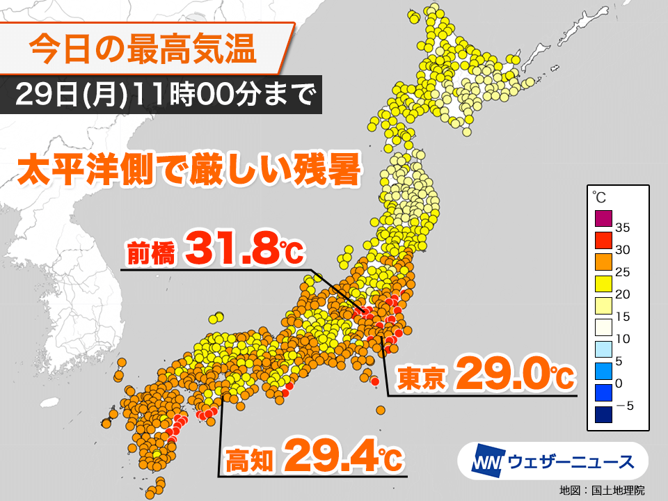 今日29日(月)は11時までに、東京29.0℃、静岡28.9℃、高知29.4℃、宮崎29.8℃まで気温が上がっています。