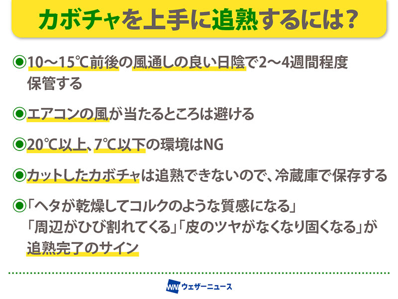 「カボチャの追熟は比較的簡単で、風通しの良い日陰で2~4週間程度保管しておきます。エアコンの風が当たるところは避けてください。温度は、大体10~15℃前後が良いので、これからの寒くなる時季は、暖房のない部屋の中でも追熟させることもできます。