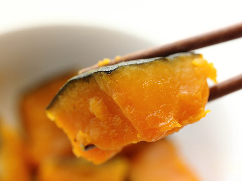 調理法としては、だしと調味料を入れてカボチャを入れたら、沸騰させずに70℃前後を保ってじっくりと煮るか、やはり低温で蒸すか、焼くのが良いと思います。茹でると水っぽくなりますし、電子レンジだと水分が飛びやすくなり、調理したてはいいのですが、時間が経つとパサパサになることがあります。