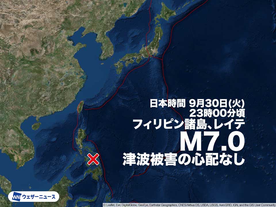 フィリピン付近でM7.0の地震 津波被害の心配なし