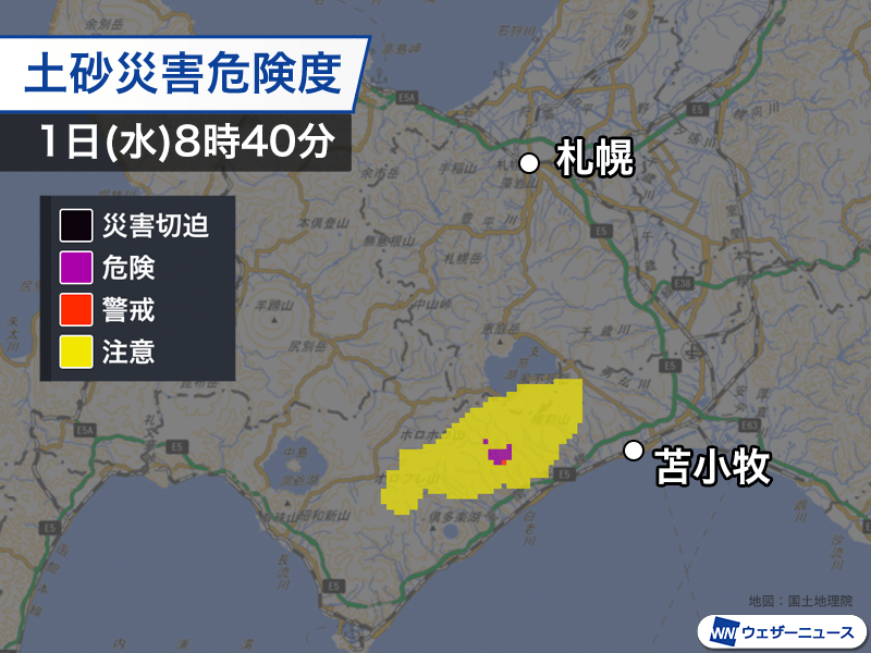これまでの雨により、すでに土砂災害の危険性が非常に高くなっている状態です。今後の雨が加わることで土砂災害が発生したり、低い土地の浸水や河川の増水などのおそれがあります。8時50分の時点で白老町に土砂災害警戒情報、苫小牧市には洪水警報が発表中です。厳重に警戒をしてください。