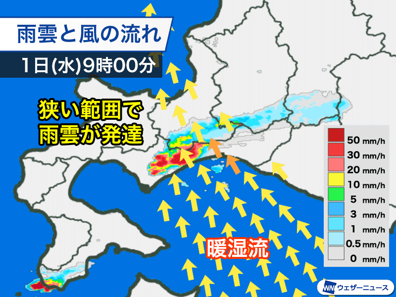 午後になると上空の寒気は若干弱まるものの、南からの湿った空気の流入は継続する見通しです。今夜にかけて雨雲の発達しやすい状況が続き、1時間に50mm以上の非常に激しい雨の降るおそれがあります。