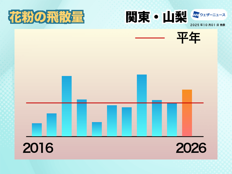 2026年春の花粉の飛散量は前年の142%、平年の139%となる予想です。前年、平年に比べて飛散量がやや多くなる予想なので対策を万全に行ってください。