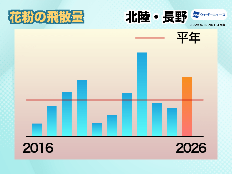 なお、北陸エリアではスギ花粉の飛散が中心で、ヒノキ花粉の飛散は比較的少ない傾向です。