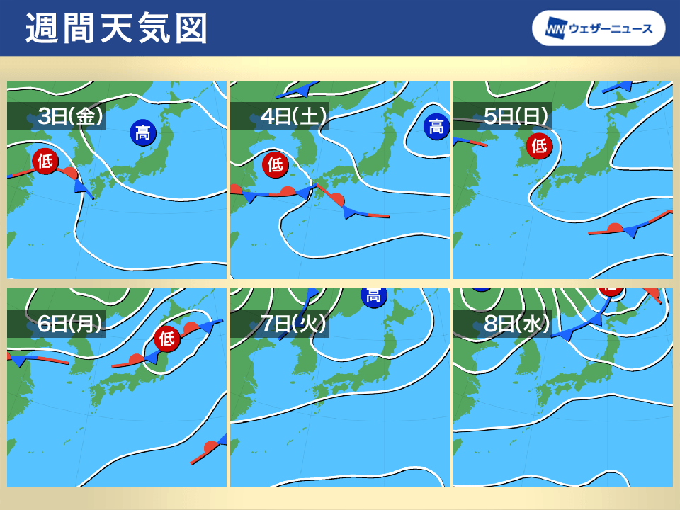 3日(金)から4日(土)は西日本を中心に雨が降る予想で、特に九州や中国地方で強い雨や雷雨となる可能性があります。また、4日(土)は低気圧と前線の位置によっては東日本の太平洋側でも雨が心配です。