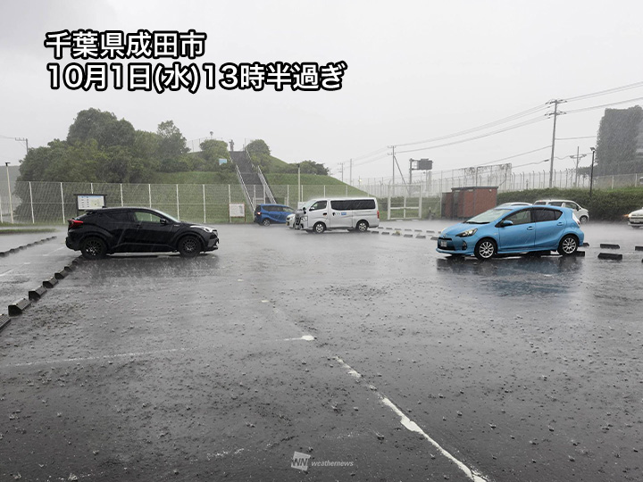 千葉県内には東寄りの風と北東の風がぶつかるシアーラインが形成されています。上空の気圧の谷が近づいてきたため、午後になってシアーライン周辺での雨雲の発達が顕著になり、雨が強まってきました。
