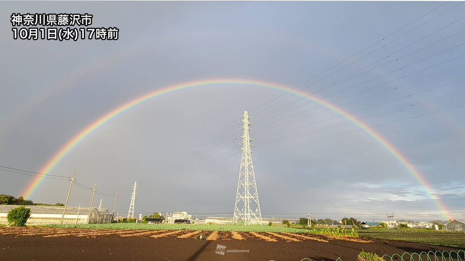 神奈川県藤沢市では半円を描くくっきりとした虹がみられ、外側には副虹もうっすらと見えています。