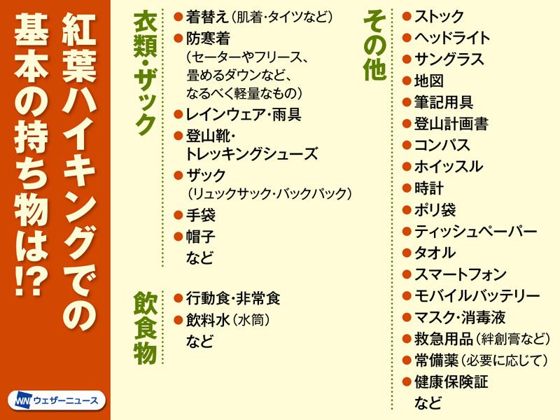 服装以外にも、不測の事態に備えた装備があると安心です。紅葉ハイキングに必要な「持ち物リスト」を教えてもらいました。