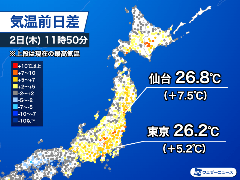 11時50分時点の気温を昨日と比べると、東京都心は5.2℃、仙台は7.5℃も高くなりました。湿度は50%前後と乾燥しているため、ウェザーニュースアプリに寄せられた体感の投稿は「カラッと暑い」や「過ごしやすい」が多い状況です。