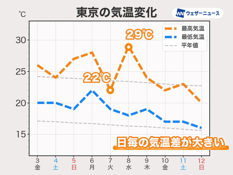 ただ、週明けは寒気の南下に伴い、北日本を中心に気温がガクッと低下します。
