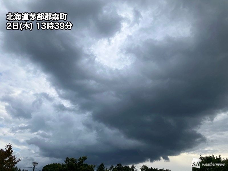局地的には雨雲が発達し、北海道長万部町では14時00分までの1時間に21.0mmの強い雨を観測しました。周辺では落雷も頻発しています。