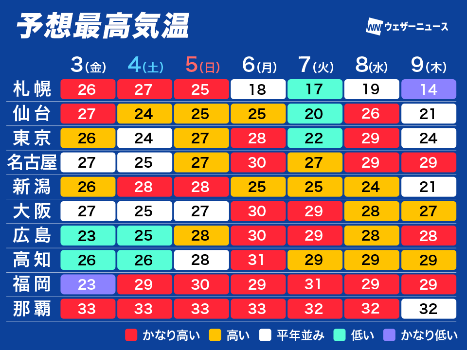 予想最高気温は名古屋や大阪、広島で30℃、高知で31℃となっています。その後も東日本、西日本では気温の高い日が続くため、農作業や運動会の練習・本番など屋外で長時間活動する場合は、念の為熱中症に注意してください。西日本では最低気温も23〜24℃と高めの傾向が続きます。