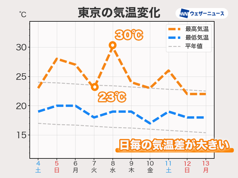 日毎、朝晩と日中の気温差に注意