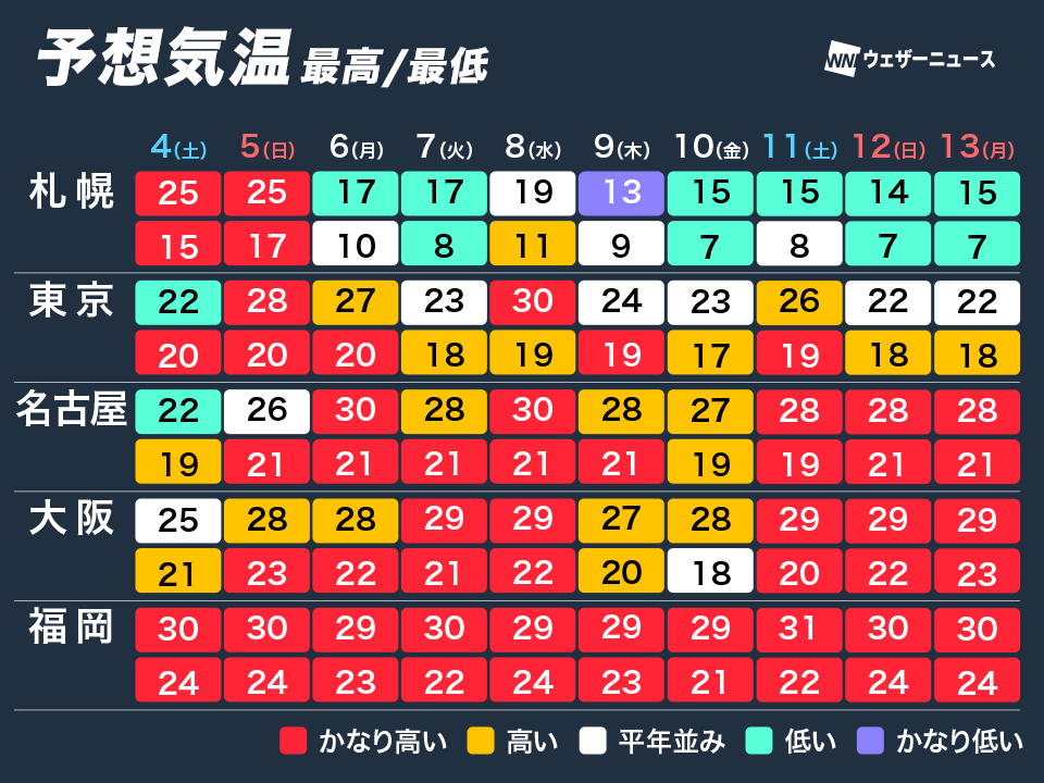この先1週間も南西諸島の上空約1,500mには+18℃という真夏並みの強い暖気が居座り、30℃を上回る深刻な残暑が続く予想です。夜でも気温が下がらず、熱帯夜が続きます。西日本や東日本では朝晩は涼しくなるものの、昼間は30℃に達する日があり、暑さ対策が必要になる日があります。農作業や運動会の練習など長時間屋外で長時間過ごす場合は、こまめに水分と休憩をとるようにしてください。