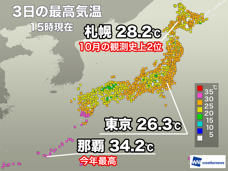 15時の時点で30℃以上の真夏日地点は47地点。九州南部から南西諸島に集中しています。最も高い最高気温は那覇の34.2℃。今年最も高く、10月としては観測史上1位の高温となりました。