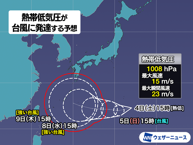 今日4日(土)9時に発生したこの熱帯低気圧は、今後勢力を強めて台風に発達する可能性が高まってきました。小笠原諸島では明日5日(日)は風が強まり、一時強い雨の降る可能性があります。