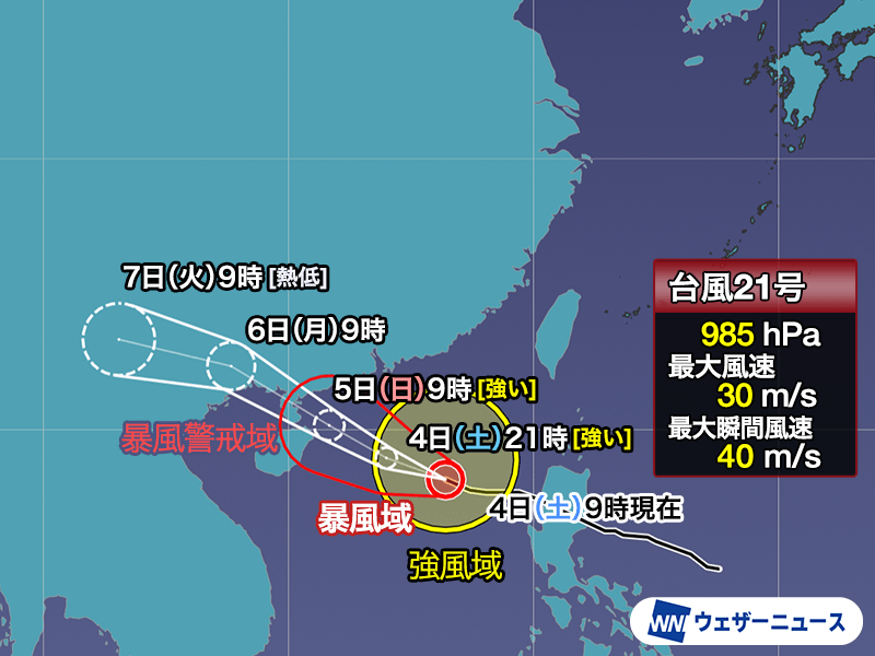 台風21号は昨日3日(金)にフィリピンのルソン島に上陸、通過した後、南シナ海を西に進んでいます。