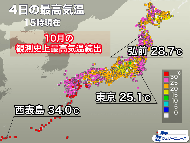青森県の弘前(28.7℃)や秋田県の能代(28.8℃)でも10月の観測史上最高気温となりました。東京の最高気温は25.1℃でした。