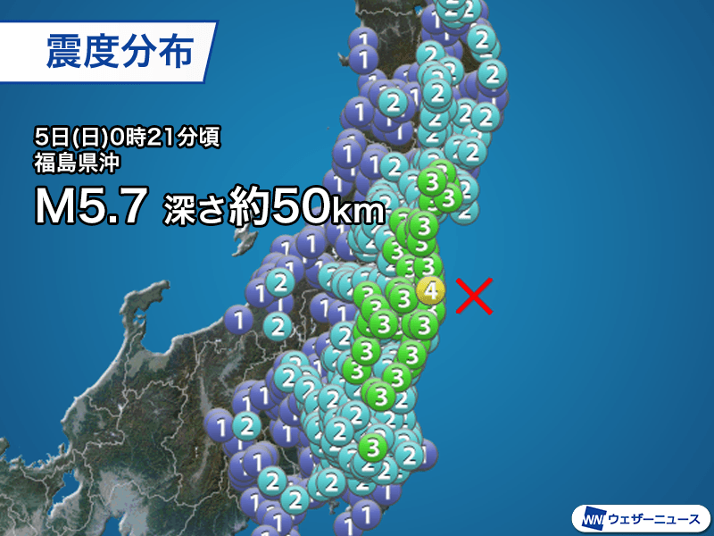 国内:福島県沖の地震で最大震度4