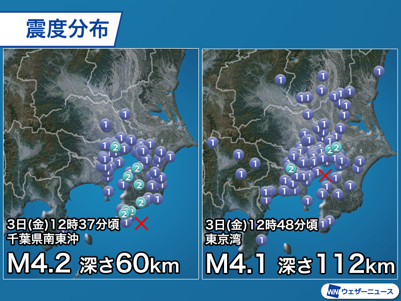 そのわずか11分後の12時48分頃には東京湾を震源とするマグニチュード4.1、深さ112kmと推定される地震が発生し、東京都町田市と千葉県市川市、白井市で最大震度2を観測しました。