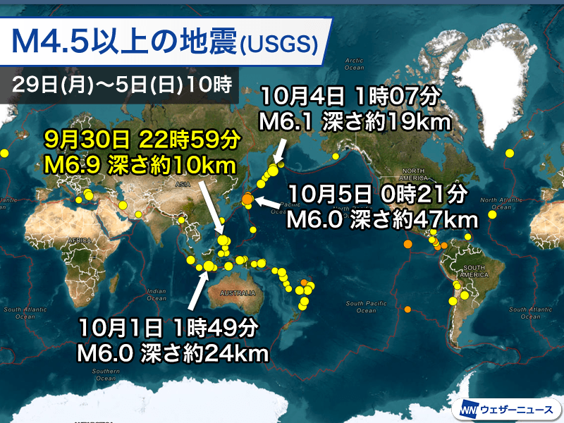 アメリカ地質調査所の解析によるマグニチュード6以上の地震は4回発生しています。最も大きな地震は、フィリピンで発生したマグニチュード6.9です。