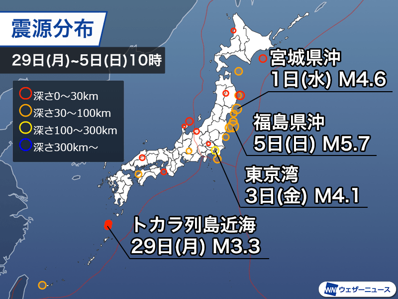 さらに1日(水)23時50分頃、宮城県沖を震源とするマグニチュード4.6、深さ59kmと推定される地震が発生するなど、東北の太平洋沿岸で震度3以上の地震が相次ぎました。