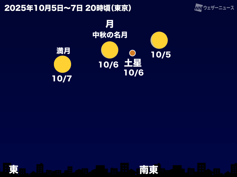 6日(月)夜は、中秋の名月の近くに「土星」の姿も見ることができます。月がとても明るいため、0.6等の土星は少し見づらいかもしれませんが、お月見の際には土星も一緒に探してみてください。