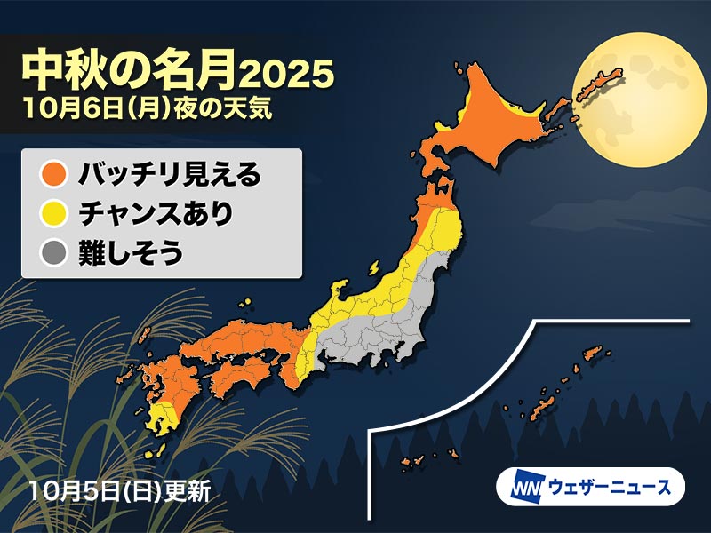 明日10月6日(月)の夜は、北海道や西日本は高気圧に覆われて晴れるため、広い範囲で中秋の名月が’バッチリ見られそうです。