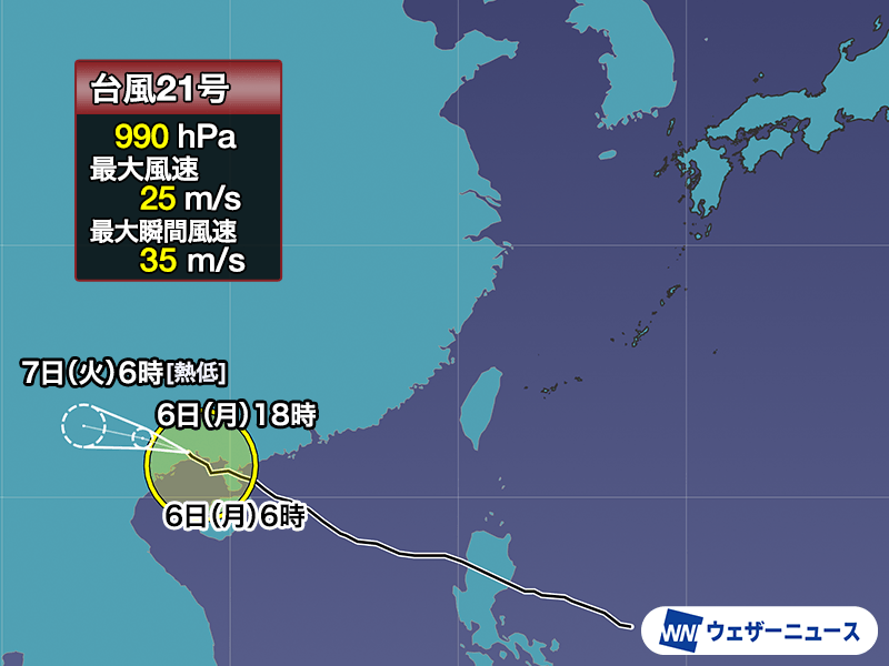 台風21号(マットゥモ)は昨日の午後に中国華南の広東省に上陸しました。今後は勢力を弱め、明日7日(火)までに熱帯低気圧に変わる予想です。