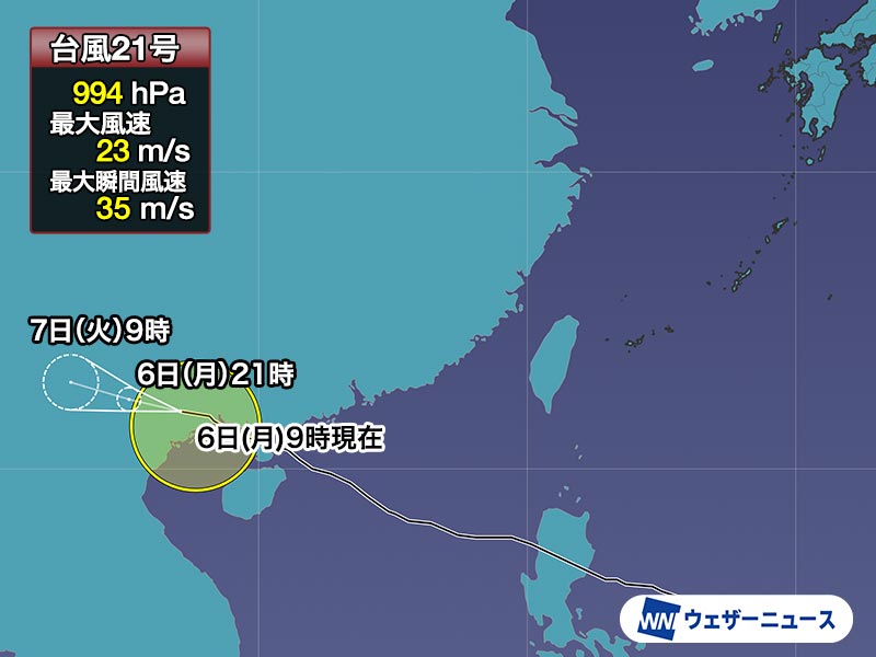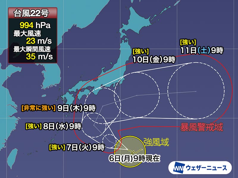 発達に適した海域を進むため、明日7日(火)には「強い」勢力で暴風域を伴い、9日(木)には「非常に強い」勢力の台風になる予想です。