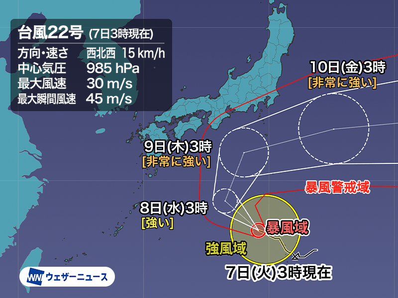 発達に適した海域を進むため、明日8日(水)までには「強い」勢力、9日(木)には「非常に強い」勢力の台風になる予想です。伊豆諸島には発達のピークを迎えたままかなり接近するおそれがあるため、暴風や大雨への備えが必要です。