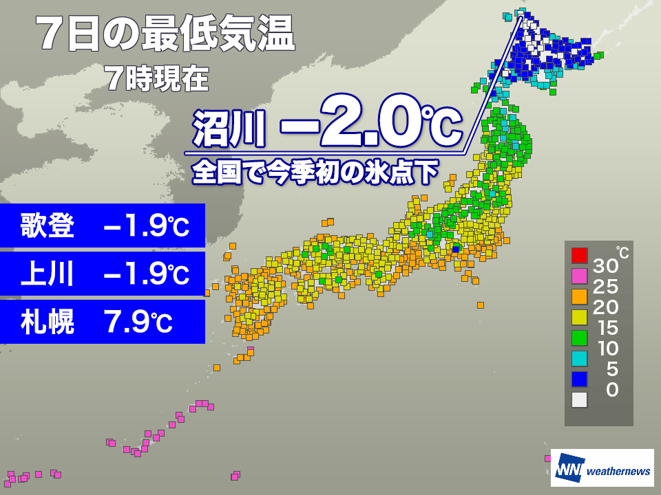 昨日から寒気が南下していた北海道では、今朝は高気圧に覆われて風が弱く穏やかに晴れました。地上付近の熱が上空へと逃げる放射冷却現象も加わって冷え込みが強まり、今季一番寒い朝となっています。