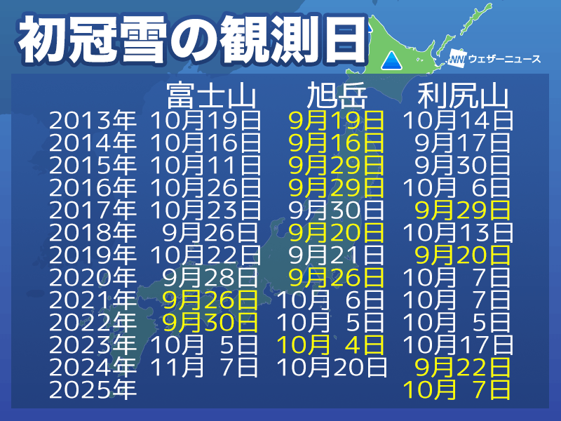 2年連続で富士山や大雪山・旭岳よりも先に初冠雪発表
