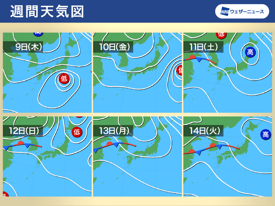 週末の三連休は日本付近を低気圧が通過するため、雲の広がるところが多くなる予想です。北日本や北陸を中心に雨の降る可能性があるため、お出かけを予定されている方は最新の予報を確認するようにしてください。