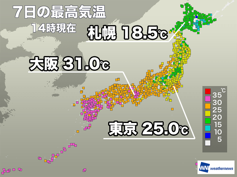 東京都心の今日7日(火)14時までの最高気温は、昨日より4℃ほど低い25.0℃となっています。関東では昨日ほど気温が上がらず、比較的涼しく感じられています。