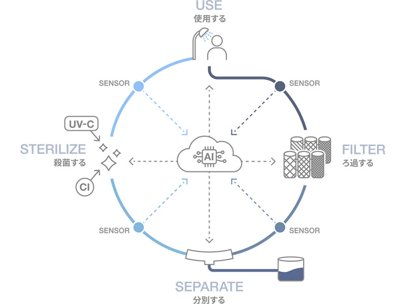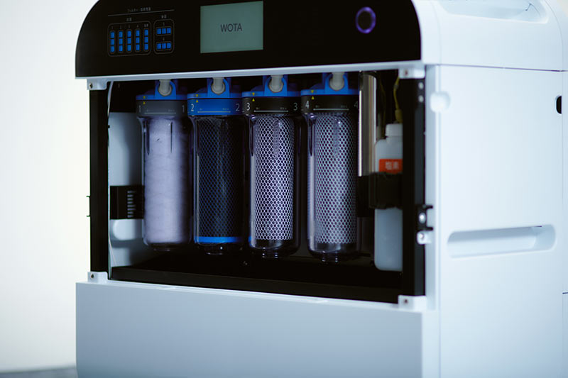 「WOTA BOX」は一度使った水を、活性炭とRO(逆浸透)膜を収めた計6基のフィルターに通して濾過(ろか)し、不純物や細菌、ウイルスを除去。深紫外線の照射・塩素系消毒剤の投入をすることで、公衆浴場の水質基準に準拠した水を提供します。排水の98%以上をその場で再生、循環(繰り返し)利用することを可能にするシステムです。