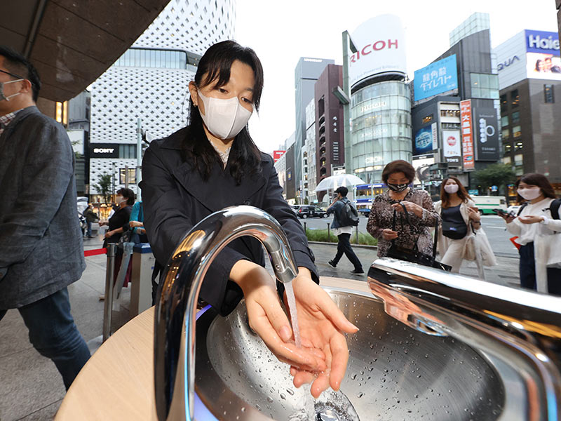 水循環型手洗いスタンド「WOSH」も排水の98%以上を再生して循環利用することができ、20Lの水で連続500回以上の手洗いが可能といいます。