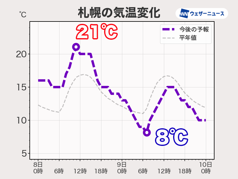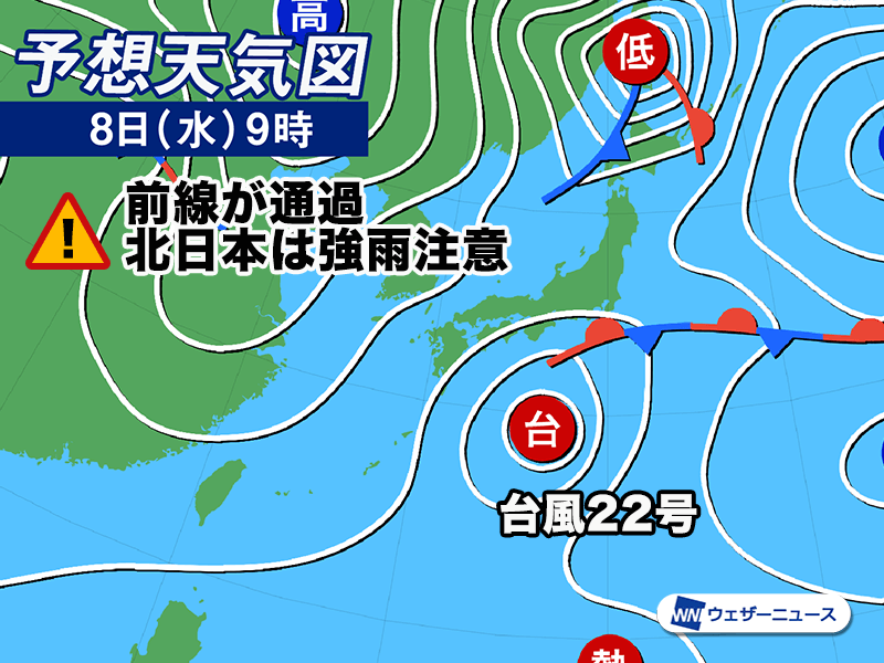 明日8日(水)は低気圧がサハリン方面に進み、寒冷前線が北日本を通過する見込みです。北海道では今夜遅くから雨が降り出してきます。
