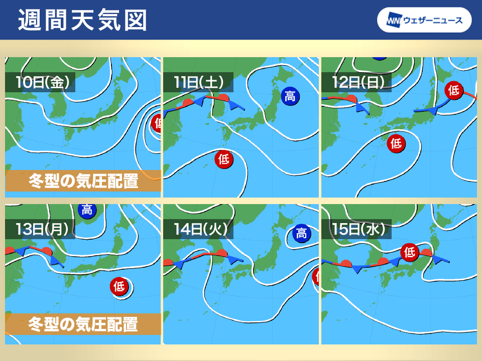 北日本ではたびたび西高東低の冬型の気圧配置となり、上空の寒気が流れ込む見込みです。
