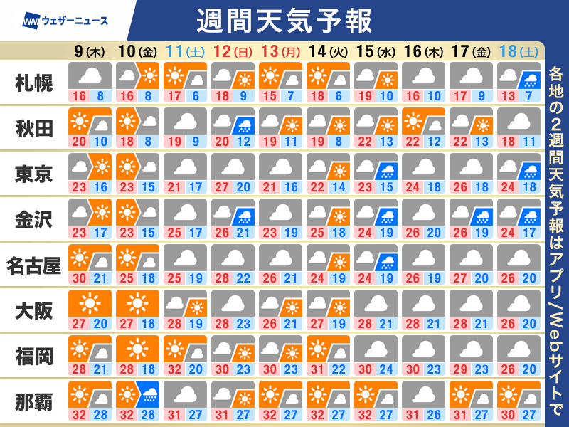 台風が東へ離れる10日(金)は晴れるところが多くなりますが、週末の三連休は前線の影響でスッキリしない天気となるところが多い見通しです。