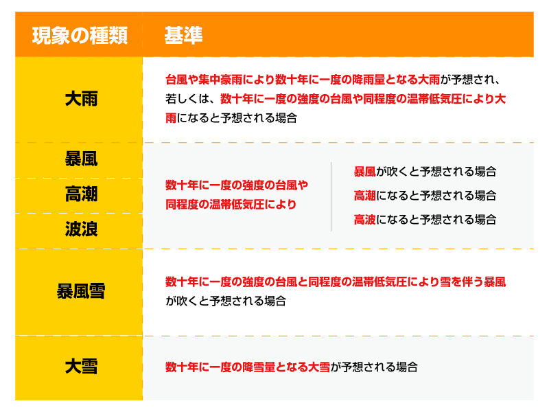 具体的には「伊勢湾台風」級(中心気圧930hPa以下又は最大風速50m/s以上)の台風や、同程度の温帯低気圧が来襲する場合が発表指標とされています(沖縄地方、奄美地方及び小笠原諸島については、中心気圧910hPa以下又は最大風速60m/s以上)。