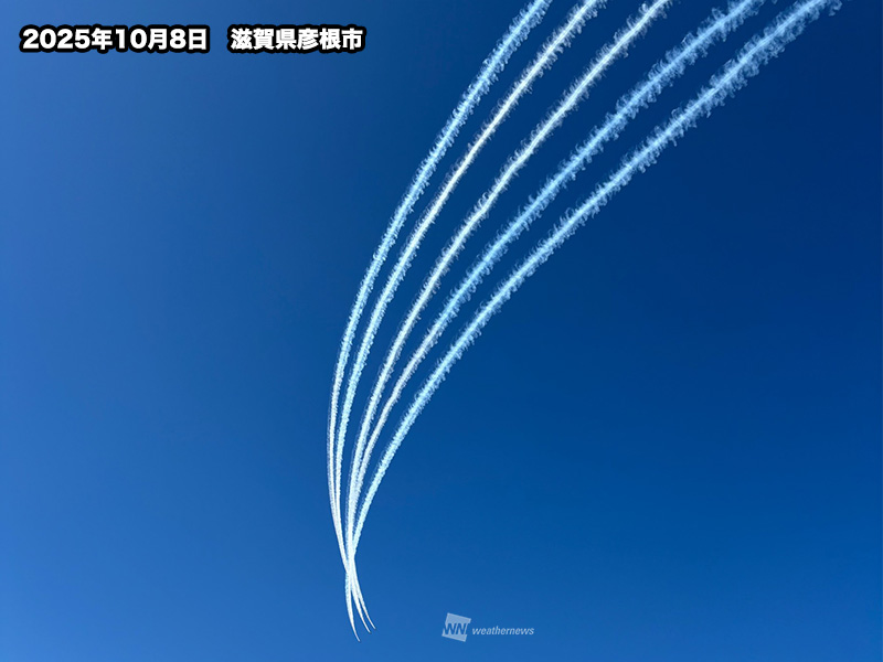 朝から彦根市の空は抜けるような青さで、絶好のフライト日和でした。白いスモークで描かれる鮮やかな軌跡は、まるで青空に絵を描く筆のようで、見上げる人々の目を釘付けにしました。
