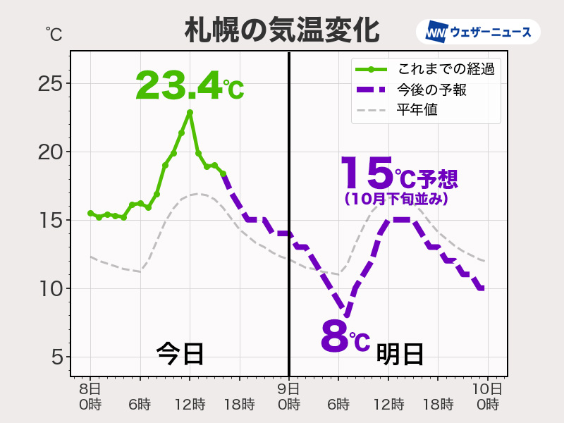 今日8日(水)の北海道は寒冷前線に向かって暖かな空気が流れ込み、気温が高くなりました。今日の札幌の最高気温は23.4℃まで上がっています。